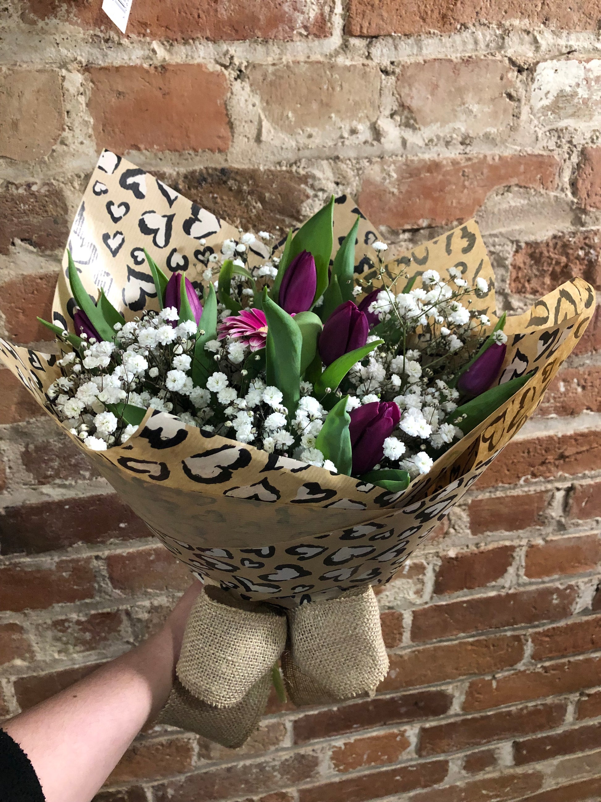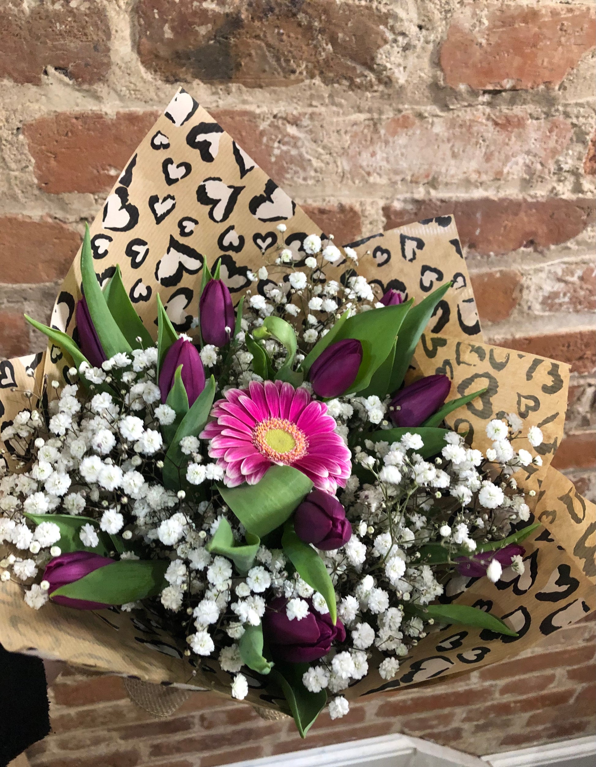 Hetty is a spring hand tied bouquet of pink/purple tulips, gypsophila and a gerbera. The perfect Spring gift for any occasion.