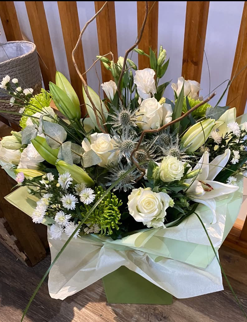 Willow is a beautiful fresh bouquet of white and green flowers, with lilies and roses, pure and elegant simplicity. This bouquet is only available in white and green flowers.